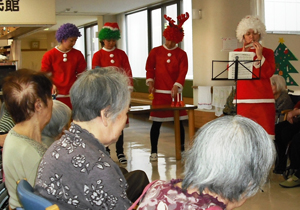 入所、通所リハビリなど、サービスごとに、季節をとり入れた様々な行事に取り組んでいます。また、地域の学校や幼稚園・保育所の生徒さんが多数訪れて、高齢者の方と楽しく過ごしています。