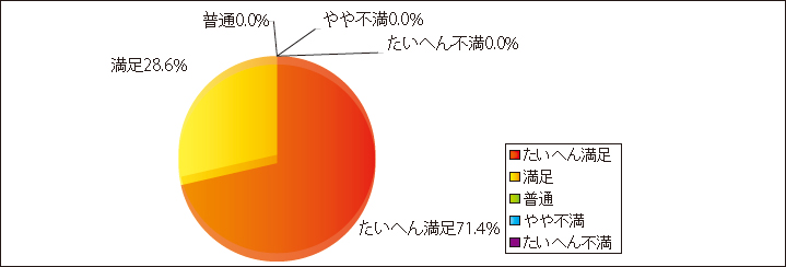 訪問リハビリテーションの総合的な満足度で71.4%の方から「たいへん満足」、28.6%の方から、「満足」(計100.0%)との評価を頂きました。今後とも、よりご満足頂けるよう努力を重ねていく所存です。また、フリー記載にて、たくさんのご意見、ご要望、激励を頂き、ありがとうございました。